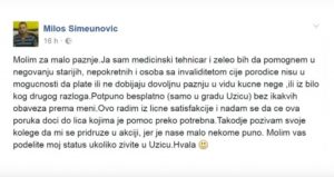 Kada se na fejsbuku pojavio status našeg sugrađanina Miloša Simeunovića u kom nudi pomoć starim, nepokretnim i licima sa invaliditetom,...