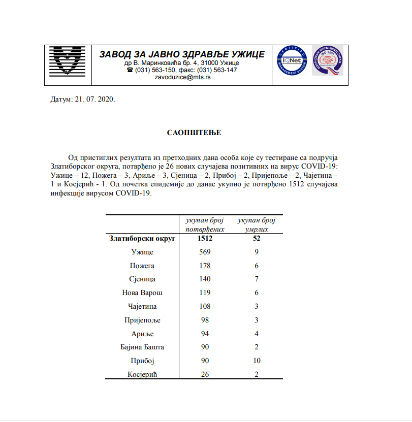 OD POSLEDNJEG IZVEŠTAJA ZZJZ UŽICE U ZLATIBORSKOM OKRUGU POTVRĐENO JE 26 NOVIH SLUČAJEVA POZITIVIH NA COVID 19