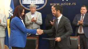 Tomislav Momirović, ministar građevinarstva, saobraćaja i infrastrukture i Jelena Raković Radivojević, gradonačelnica Užica, potpisali su ugovor o finansiranju sanacije klizišta...