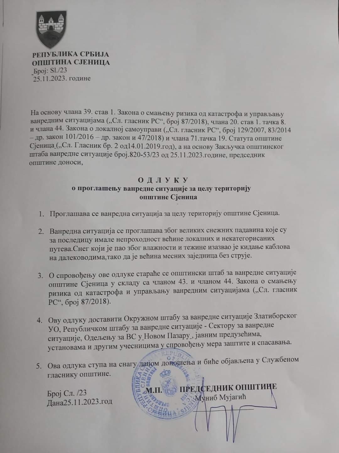 Председник општине Сјеница Муниб Мујагић изјавио је, након проглашења ванредне ситуације на територији те општине, да су поједина места остала без струје, зато што је далековод испао из система, а прегорео је један од главних прекидача.