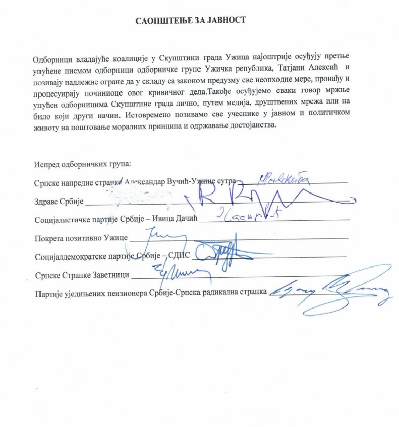 Одборници владајуће коалиције у Скупштини града Ужица најоштрије осуђују претње упућене писмом одборници одборничке групе Ужичка република, Татјани Алексић и позивају надлежне огране да у складу са законом предузму све неопходне мере, пронађу и процесуирају починиоце овог кривичног дела. Такође осуђујемо сваки говор мржње упућен одборницима Скупштине града лично, путем медија, друштвених мрежа или на било који други начин. Истовремено позивамо све учеснике у јавном и политичком животу на поштовање моралних принципа и одржавање достојанства.