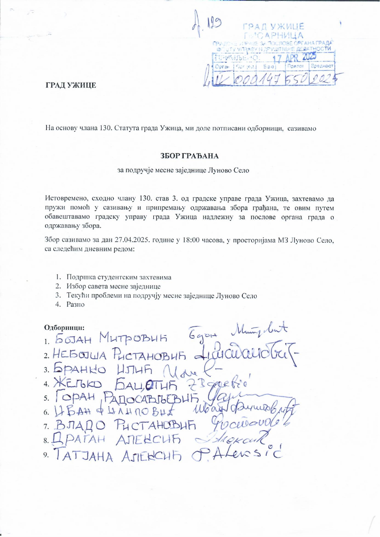 УЖИЦЕ: ПОЗИВАЈУ СЕ ГРАЂАНИ КОЈИ ИМАЈУ ПРЕБИВАЛИШТЕ ИЛИ ИМОВИНУ НА ПОДРУЧЈУ МЗ ЛУНОВО СЕЛО ДА ПРИСУСТВУЈУ ЗБОРУ