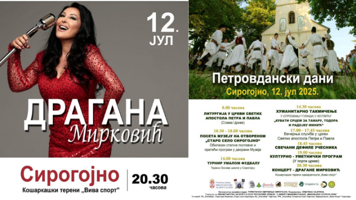 У златиборском селу Сирогојну, 12. јула, одржаће се манифестација „Петровдански дани“ која промовише традицију и културно наслеђе. Манифестација је предвиђена да почне у раним јутарњим часовима свечаном Литургијом у Цркви Светих апостола Петра и Павла, прослављајући славу села. Након литургије за све посетиоце ће бити организована бесплатна посета Музеју Старо село, обилазак сталне музејске поставке и организован пратећи програм у дворани Музеја.
